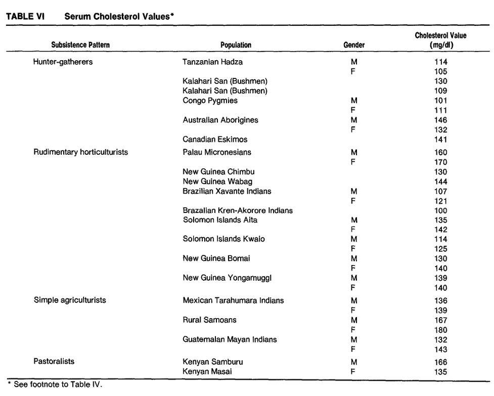Kolesterolnivåer hos diverse undersøkte tradisjonelle grupper er vist i tabellen under.
