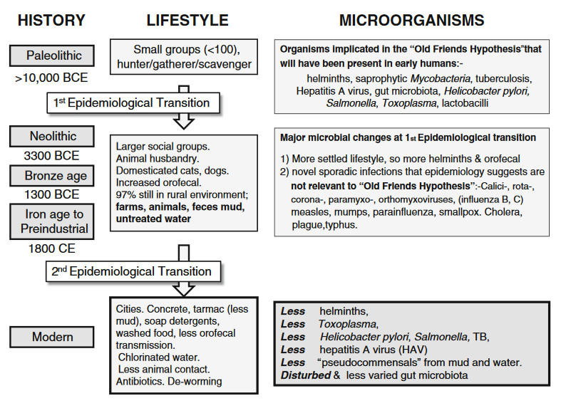 Finally, under some circumstances (see comment after question 6 below) certain “Old Infections” such as tuberculosis, Helicobacter pylori or helminths might also be useful. (Unlike the Crowd Infections, the “Old Infections” were able to persist for life in isolated hunter-gatherer groups without killing the host). So the “Old Friends Hypothesis” was born, suggesting that exposure to maternal microbiota, organisms from the natural environment, and some Old Infections, might be essential for the correct development of the immune system.
